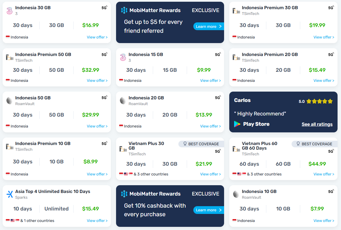 MobiMatter offers a wide range of pricing options, making it one of the more flexible eSIM marketplaces for Bali travelers. Instead of a single fixed product, users can choose from multiple data sizes and price points, typically valid for 30 days, depending on the provider behind the plan.