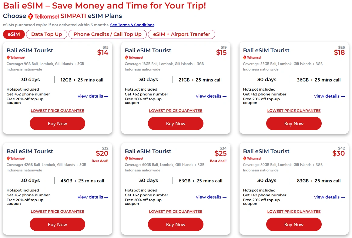 These plans deliver better value for common Bali stays (3–7 days, 10–14 days, and 30 days), with more data for the price. BaliEasy also supports easy online data top-ups without reinstalling the eSIM, and pricing is clear with no hidden fees or confusing terms.