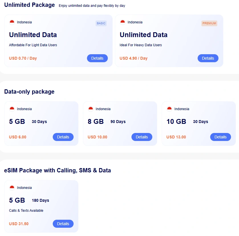 RedteaGO offers several plan types for Indonesia, including daily “unlimited” plans, fixed-data packages, and plans labeled with calling and SMS support.