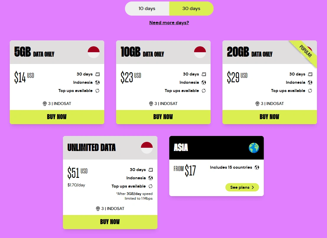ZenSim offers both 10-day and 30-day plans, which can be appealing for travelers on very short trips who only need data for a limited time. The shorter validity makes ZenSim a reasonable option for quick visits to Bali.